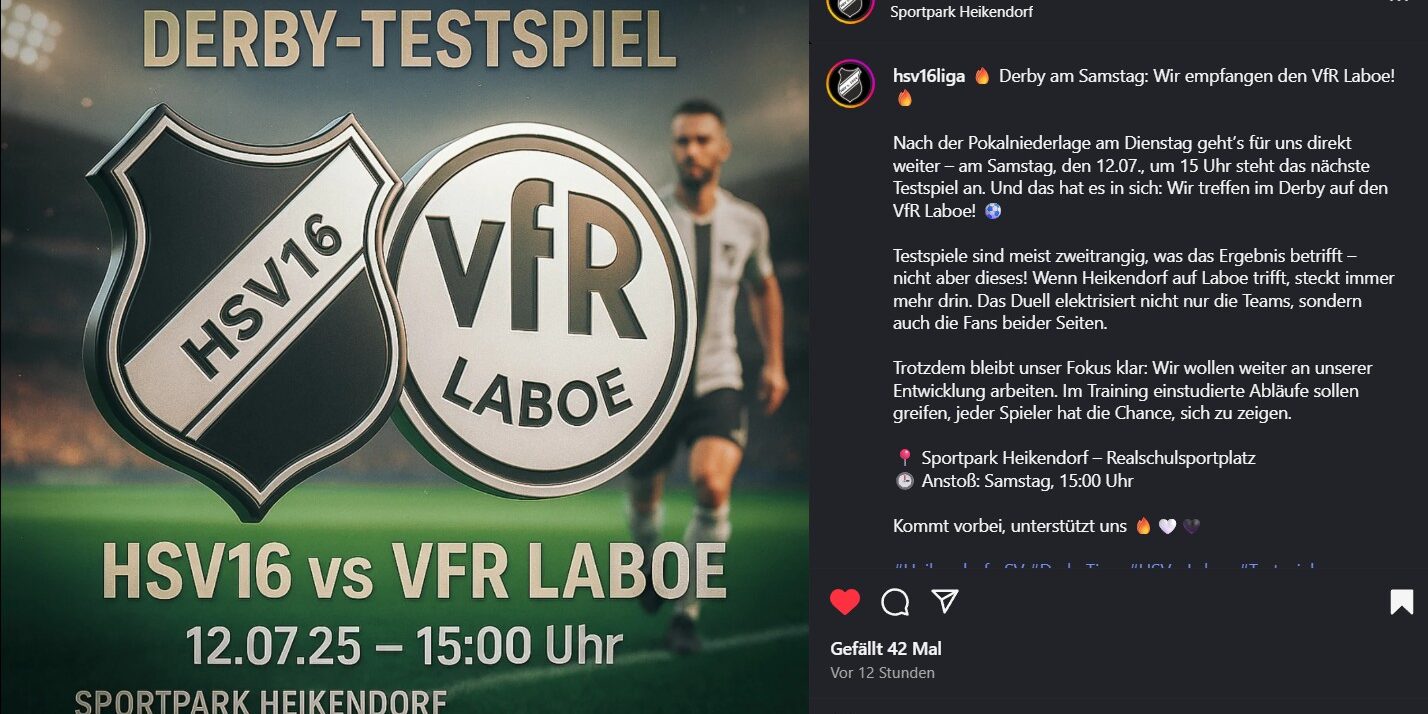 Juli122025NewsCategory: News12. Juli 2025KommentarnavigationZurückVorheriger Beitrag:0:4 trotz starker MannschaftsleistungNächstesNächster Beitrag:Testspielsieg im DerbyRelated PostsLetzter Auftritt im Jahr 2025 mit Topspiel26. November 2025Wir grüßen von der Tabellenspitze10. November 2025Rückrundenstart in Dänischenhagen7. November 2025Last-Minute-Sieg gegen den SSV3. November 2025Wiedergutmachung im Sportpark?30. Oktober 2025Vermeidbare Niederlage in Plön28. Oktober 2025